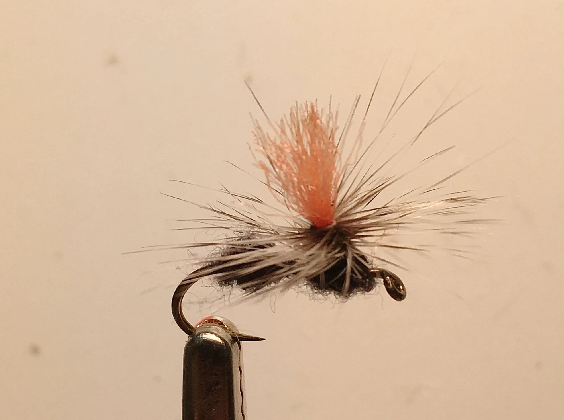 - Parachute wing – grizzly neck hackle, sized to match hook size